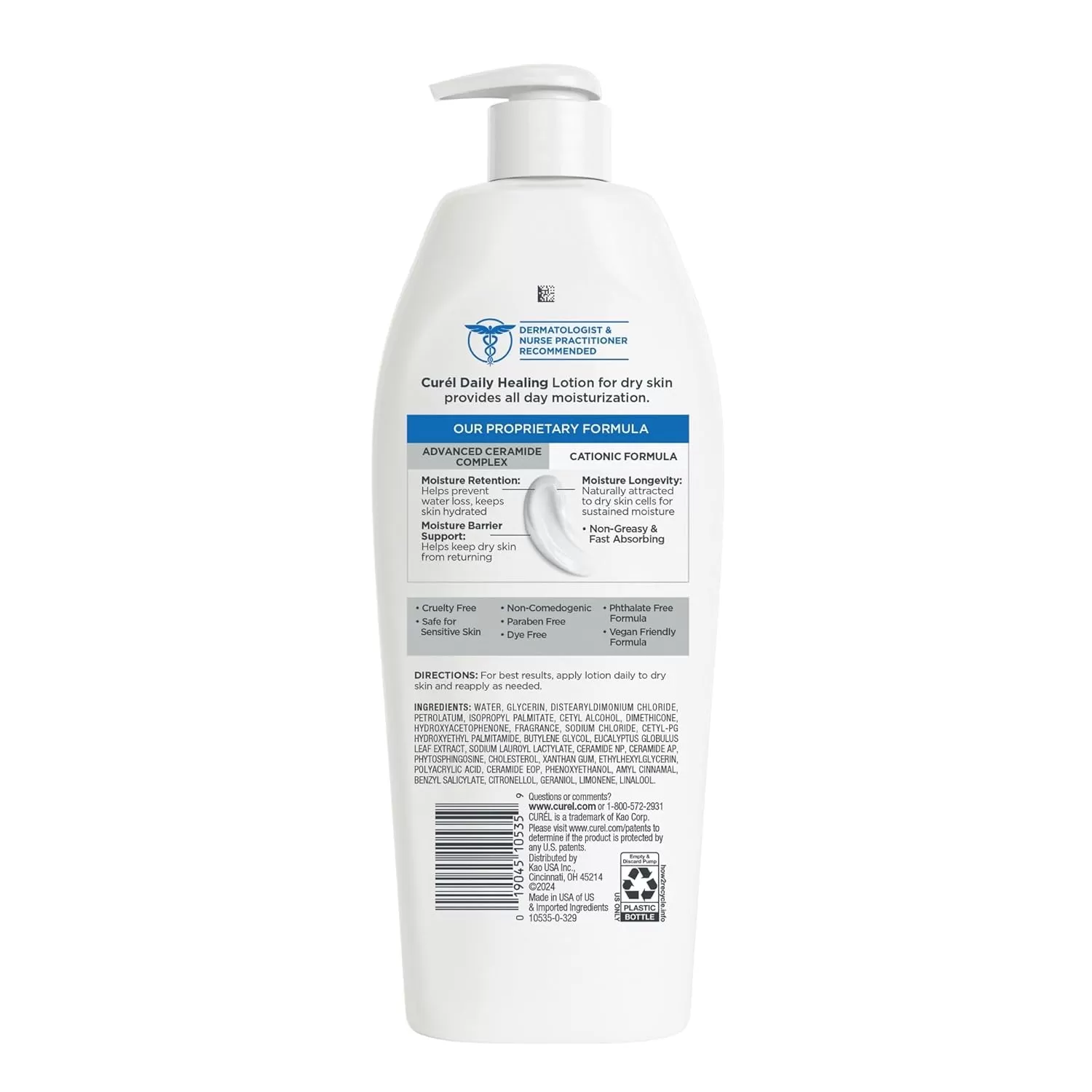 Relieve dry skin and keep it hydrated all day long with Curel Daily Healing  Body Lotion. While traditional moisturizing body lotion only hydrates skin's surface, this skin hydrating lotion with the Advanced Ceramide Complex works at the source of dryness in skin, helping repair its moisture barrier, to help retain moisture and prevent symptoms of dry skin from returning. The hydration in this dry, sensitive skin moisturizer is clinically proven to provide 24 hours of continuous moisture. Comforts dry skin and leaves it feeling hydrated and soft. Use this skin hydrating cream from head-to-toe as a moisturizing body lotion and dry skin hand lotion. This non-greasy, fast-absorbing, non-irritating sensitive skin lotion helps to hydrate, relieve and repair dry skin. Dermatologist recommended hydrating body lotion is suitable for sensitive skin.  No ordinary dry skin moisturizer, it’s formulated to be paraben-free, dye-free, phthalate free, non-comedogenic, cruelty-free, and vegan-friendly.