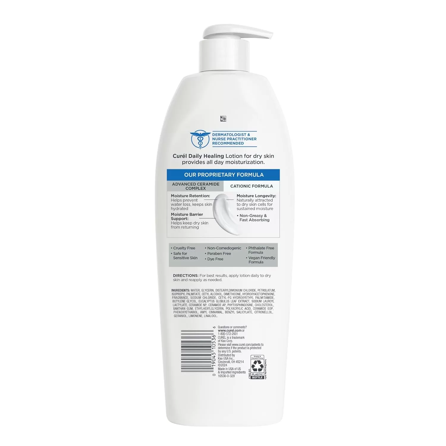 Relieve dry skin and keep it hydrated all day long with Curel Daily Healing  Body Lotion. While traditional moisturizing body lotion only hydrates skin's surface, this skin hydrating lotion with the Advanced Ceramide Complex works at the source of dryness in skin, helping repair its moisture barrier, to help retain moisture and prevent symptoms of dry skin from returning. The hydration in this dry, sensitive skin moisturizer is clinically proven to provide 24 hours of continuous moisture. Comforts dry skin and leaves it feeling hydrated and soft. Use this skin hydrating cream from head-to-toe as a moisturizing body lotion and dry skin hand lotion. This non-greasy, fast-absorbing, non-irritating sensitive skin lotion helps to hydrate, relieve and repair dry skin. Dermatologist recommended hydrating body lotion is suitable for sensitive skin.  No ordinary dry skin moisturizer, it’s formulated to be paraben-free, dye-free, phthalate free, non-comedogenic, cruelty-free, and vegan-friendly.